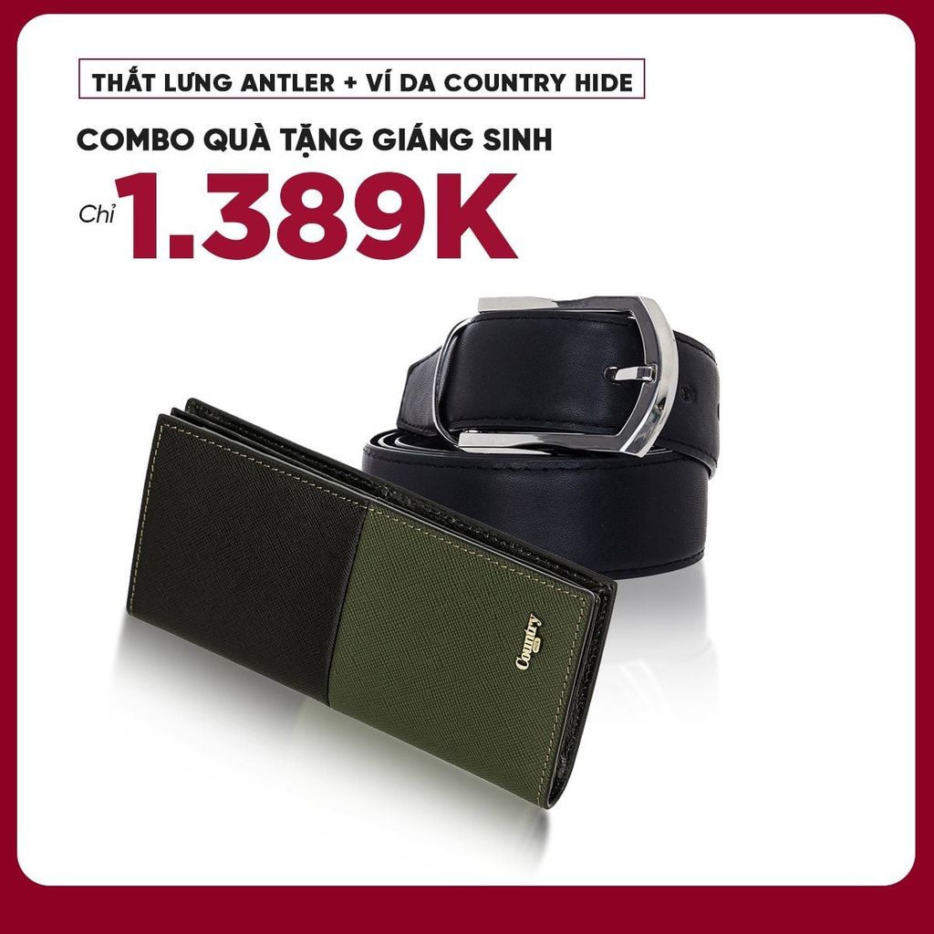 Nếu bạn đang tìm kiếm một món quà vừa tinh tế, vừa thể hiện sự quan tâm trong dịp Giáng Sinh, combo quà tặng gồm thắt lưng Antler và ví dài Country Hide là gợi ý đáng cân nhắc. Cả hai sản phẩm đều được chế tác từ da thật, thiết kế thanh lịch, phù hợp với nhiều phong cách khác nhau, từ công sở đến dạo phố.