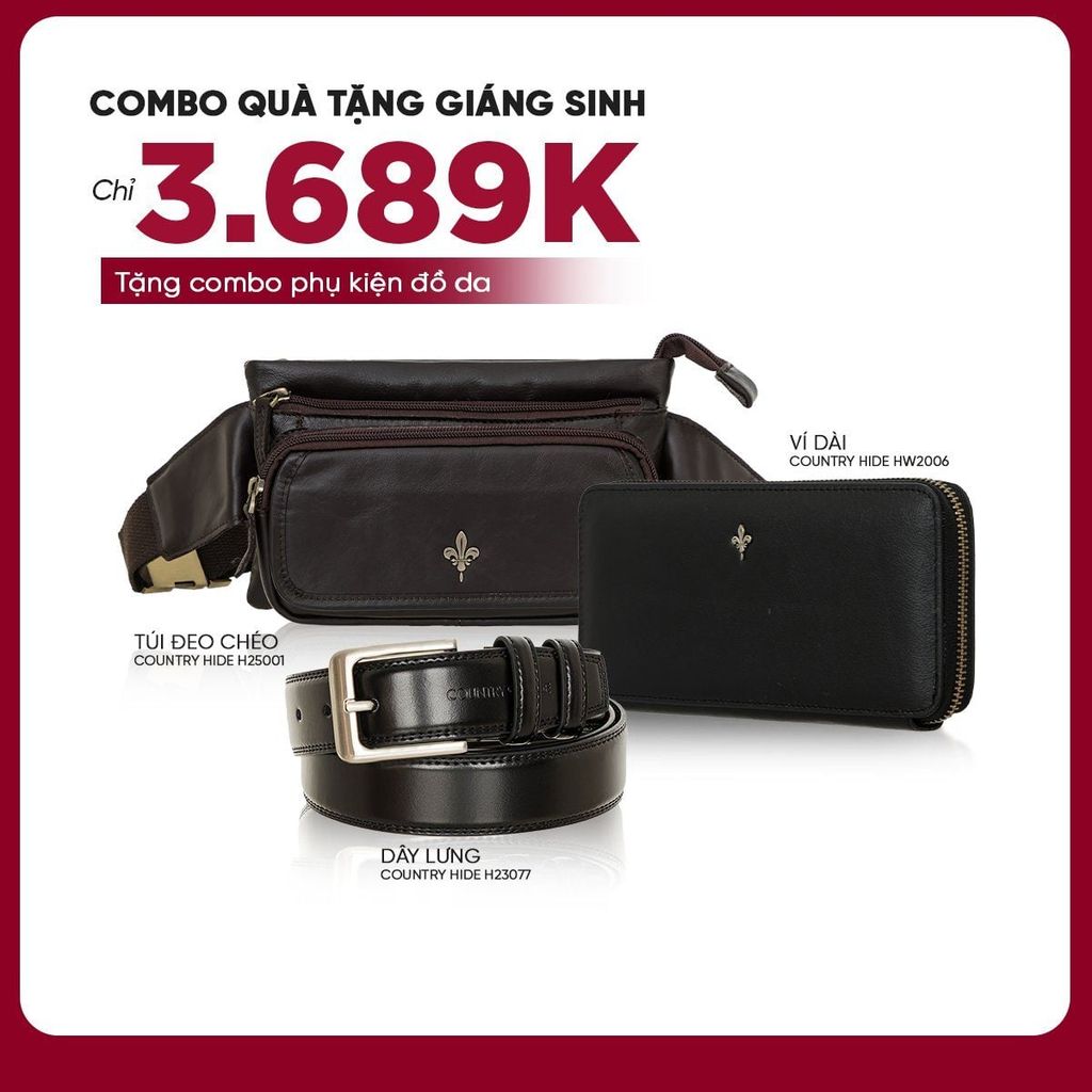 Với những ai muốn chuẩn bị quà tặng lớn hoặc nâng cấp trọn bộ phụ kiện da cho bản thân, combo Giáng Sinh gồm dây lưng, túi đeo chéo và ví Country Hide là lựa chọn đáng chú ý. Bộ sản phẩm mang phong cách đồng nhất, chất liệu da thật cao cấp và tính ứng dụng cao trong đời sống hằng ngày.