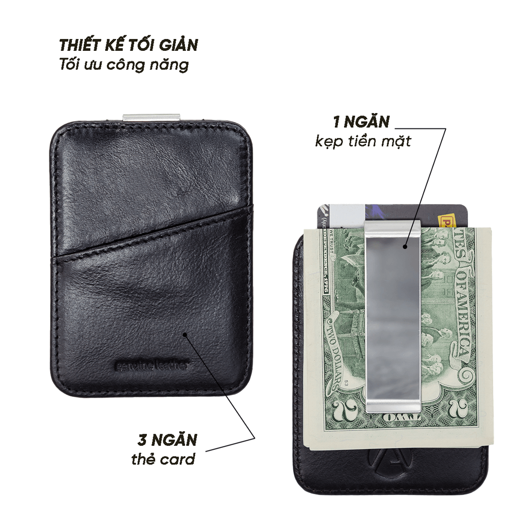 Ví được bố trí 3 ngăn đựng thẻ card và 1 ngăn kẹp tiền mặt, đáp ứng nhu cầu sử dụng cơ bản một cách gọn gàng và khoa học. Thiết kế tập trung vào sự tiện dụng, giúp thao tác nhanh chóng và dễ dàng.
